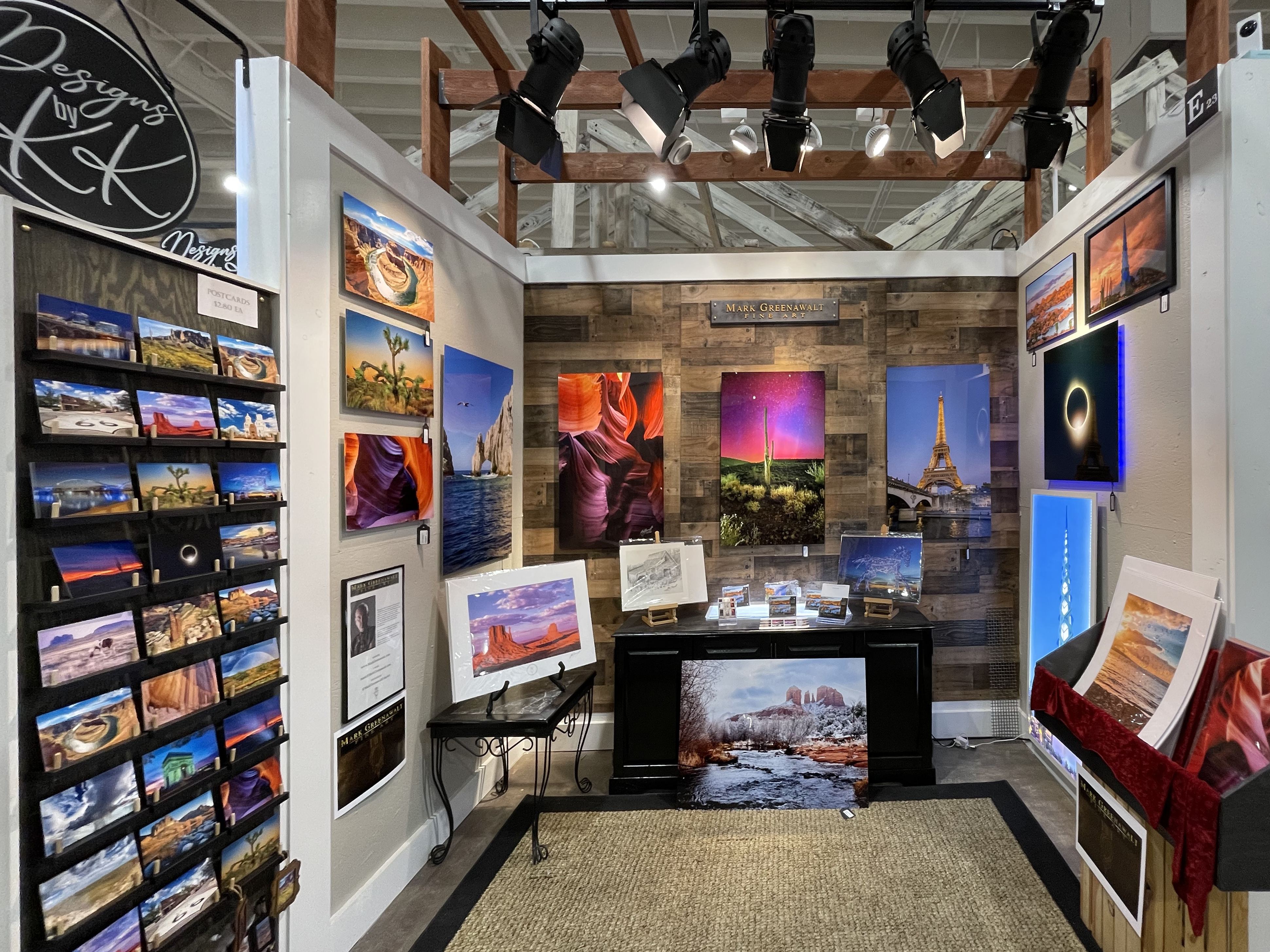 My 'bricks and mortar' gallery space in Scottsdale has been a fantastic way to introduce my fine art photography to more and more potential collectors. It's been a labor of love to evolve this booth at The Painted Tree store at the Scottsdale Promenade. The images above show the 'before' from when I opened in August, and the 'after' as it is adorned in December. I've put my woodworking skills to work to make the print bin on the right and the postcard rack on the left, not to mention fabricating the trellis above from scratch to hang the theatrical lighting system. My friend Ed Clapper helped with some 3D printing to make my sign on the back wall (not the 'Designs by KK' sign which is my neighbors...kinda' confuses things that it's written on my side also). I'm a little shy of breaking even each month, but I've been gaining momentum with sales and honing in on what garners the most interest. I added a metal print of the solar eclipse that has LED lights to halo the print itself and I also have a backlighted canvas of the Frank Lloyd Wright spire on the right side. My wife found the dresser being given away by a neighbor so I collected it and painted it black. It has become a great shelf for my desk calendars and the tree ornaments with my photography that I introduced for the holiday season. Please stop by if you are in the neighborhood and see the evolution!