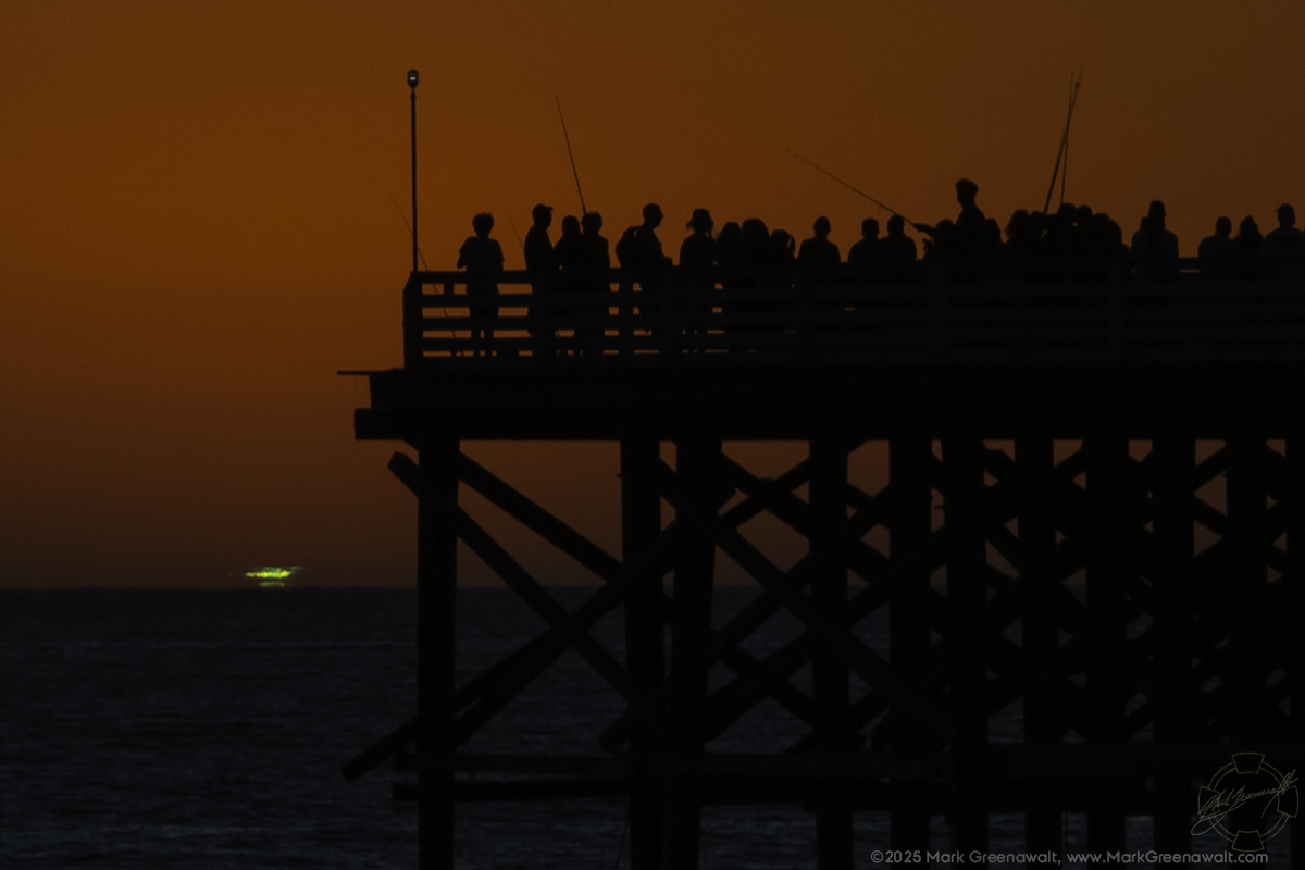 This picture may not be very intriguing to most people, but I was thrilled to capture the elusive 'Green Flash' at sunset at Crystal Pier at Pacific Beach, San Diego. I studied optical engineering at Penn State and have worked in the lighting field for quite a while, but this phenomenon still amazes me. I'm going to be making a video to explain it, but I still need to research it more myself. The quick story is that the suns light is bending into a prism when it hits our atmosphere. Of the rainbow of colors, Red/Orange/Yellow dip below the horizon first and the Blue/Indigo/Violet get scattered the most in our atmosphere leaving Green to dominate for a very brief moment. However, this doesn't happen every day (I know...I tried 4 days while in San Diego and only one sunset delivered the green). There is more to do with mirage effect of atmospheric conditions and the clear line of site to the horizon. I hope to be a self-proclaimed expert before I do the video.