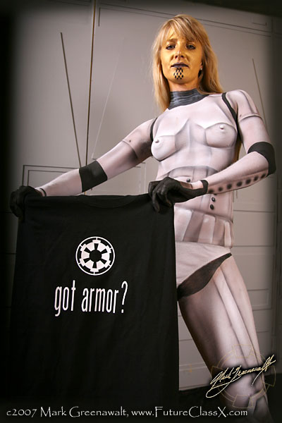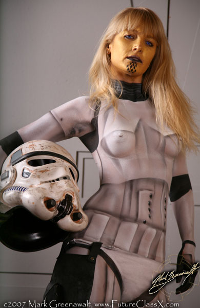 This year for LepreCon 33, I had two presentations planned. The theme for both projects was Star Wars since the author guest of honor was Karen Traviss who has written a handful of very well received novels on the Star Wars extended universe. My first panel was a live bodypainting demonstration on Friday night. As I researched ideas for my bodypainting, I first looked at the covers of Karen's novels to see if there was an opportunity for a character that could be bodypainted. At first I was disappointed to see that most of her covers showed stormtroopers in full armor costumes. But then the inspiration struck and I thought it might be a really cool challenge to paint a stormtrooper costume on a nearly nude model. I don't think that anyone has done this before, at least not to my knowledge. So the plan was roughed out. My model for the project was Jill Valdisar who had worked with me at a previous CopperCon event for the back painting of the Moon of Pern. The force was with me, so to speak, when I had the assistance of the Arizona 501st Stormtrooper Legion at my disposal for props and technical details. I especially need to thank Mark for the use of his helmet, gun, and holster. More importantly, he had his stormtrooper armor on-hand so that I could refer to it for reference. I once again had the opportunity to shoot the picture in front of the Death Star wall that the 501st let me use for the Mara Jade bodypainting at CopperCon 22.