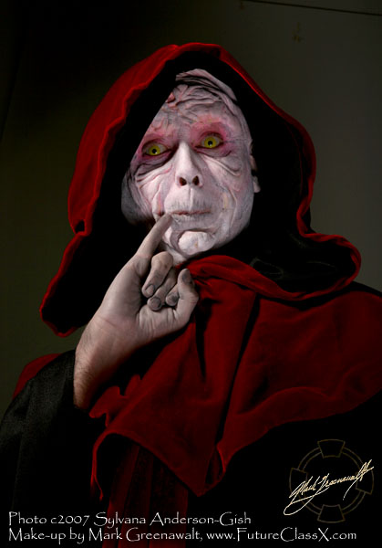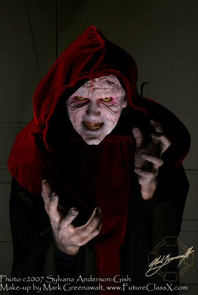 My second panel for this convention took place early on Saturday morning. I had been waiting a long time for the "right time" to don a Darth Sideous costume. I had been dabbling in prosthetic make-up application and I was looking for a foam latex version of the Sideous face when I happened upon one. Nick Wolfe, one of the famous twins behind the successful Wolfe FX and bodypaints, had sculpted this Darth Sideous prosthetic and I was able to coerce him into making a copy for me. For several months I gathered up more of the elements of this costume including the yellow eye contacts and the tooth paint. I started sewing my own blood red robe and had been searching for a high quality light saber replica, but these two items were not completed before this event. The robe, although not accurate to the movie, looked at least original and paid homage to the original. Most of my bodypainting demonstrations are done on models, like the stormtrooper above, but this time I was applying the prosthetic make-up to myself. I brought a mirror and set up on stage so that I could see my face and I was still facing the audience. The prosthetic appliances were applied using Prosaide for the adhesive. The face paint used was by Wolfe Brothers of course and the tooth paint was by Mehron. I am not used to contacts so I thought that it would be best to apply the make-up without wearing them so they were put in after I applied the make-up. I wouldn't recommend this order of events for future reference since I had also painted my hands and kept getting make-up in my eyes trying to get the contacts in place (live and learn). Once the make-up was on, contacts in place, teeth painted, and robe adorned it was time for the photoshoot. I had my camera there, but no one to take my picture. I asked several people, but it seemed that everyone had somewhere else to be. Then as fate would have it, Sylvana Anderson-Gish walked by. I knew that she was woman of many talents, but I wasn't aware that she was an acomplished photographer. She took the photos that you see here of me as the Sith Lord. I had initially wanted to do this panel early in the morning so that I could hang out all day in costume. I especially wanted to hit the masquerade party and take in a few panels, but I guess I wimped out. My hat is off to the people of the 501st who stay in costume for long hours at a time. The contacts started itching my eyes, I felt a little claustrophopic in the prosthetics, and wearing black clothes under a heavy black robe when it's about 115 degrees in Arizona was the straw that broke the camels back. I was home and out of costume by about noon. I was glad that I did get to meet up with Karen Traviss before I left and someone out there has a picture of the two of us together. I'll post it once I find it. Here are some additional pictures from the event: