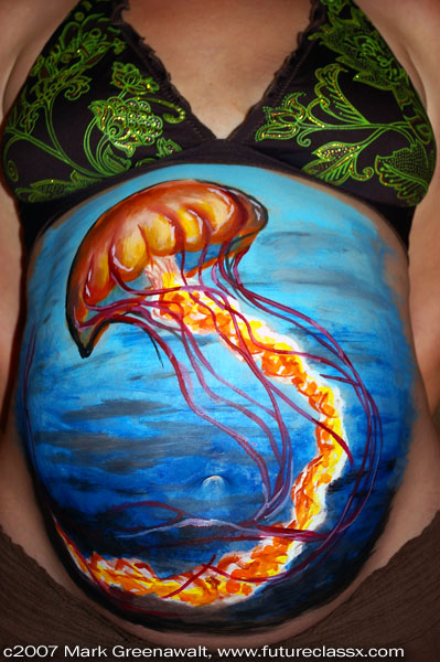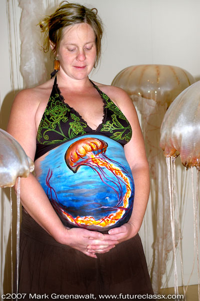 It's called SOUND intheground and it is an event that has to be experienced to be able to be understood. It is self described as "Sound in the Ground is 4x a year event that features music, fashion, cooking demos, performance art, spoken word, hands on activities, free snacks, a cash bar and whatever else we can think of to enhance your experience of the fab art exhibits that are showing at Mesa Contemporary Arts." I had met one of the event organizers at last year's Horror and Sci-Fi Film Festival and she asked if I would be interested in being a part of this project. I told her that I would be thrilled and the rest is history. Each event has a theme and on Thursday, March 29th, 2007 the theme was Jelly/Belly. The inspiration for the theme began with a large scale 3-dimensional installation by artist Gwyneth Scally that featured a 20' painting on the wall as a backdrop to resin and cloth jellyfish suspended from the ceiling. This display was very intriguing and was the keystone of the event. Also booked for the event was a troupe of belly dancers. From there the theme spiraled out of control to incorporate as many things 'jelly' or 'belly' as possible. Someone must of mentioned belly painting and suddenly I was in like Flint! In keeping with the theme, I planned on painting two pregnant models with jellyfish bellies. Unfortunately the first model had to cancel, but fortunately I found a volunteer to have her belly painted. She wasn't pregnant so her belly was flat, but it still qualified as a belly painting. She mentioned that she was a pieces so I opted to add a pair of fish around this jellyfish painting. Here are two images of her painted. The first is with Scally's jellyfish display and the second is in front of another art peice made up of onion skins. Click on each picture to enlarge the image. Next up was my pregnant model. There was no doubt that she was showing and in fact she was just days away from her due date. She was very patient as I painted this jellyfish and thankfully she didn't go into labor before we had a chance to take the following pictures. After these paintings and photoshoots, I took a moment to check out some of the acts which included Attack of the Giant Squid, Tucson Puppet Works, Rocketline, and Djentrification. Of course I also took in some of the wonderful snacks which obviously included jelly beans. With plenty of time to spare before the event came to a close, I had the pleasure of painting one more volunteer belly from amongst the event attendees. I kept the ocean theme up but no jellyfish in this one, just a tranquil sunset with a ship silloughted on the high seas. Here is one shot of this painting. A Photographer from Phoenix NewTimes was on hand taking pictures. Here below is a shot of one of my painted bellies and another shot of me painting another belly. The tag lines for these images were "THAT'S A WHOLE LOTTA BELLY, BABY!" and "THIS DUDE LOVES HIS JOB." More images from the event can be found on-line at http://www.phoenixnewtimes.com/gallery/index.php?albumID=14&catID=161.