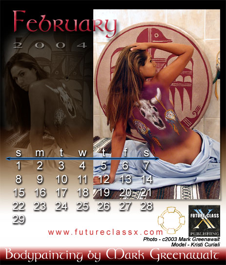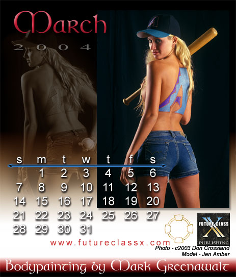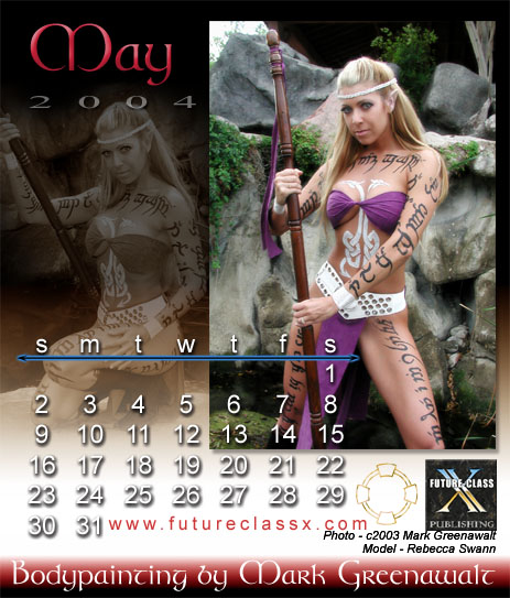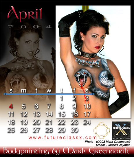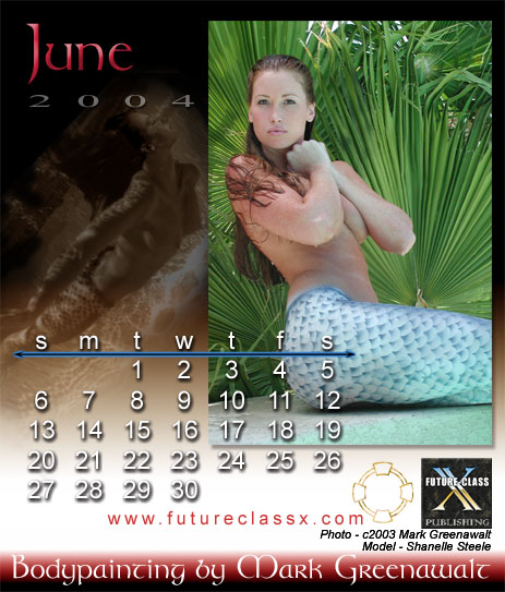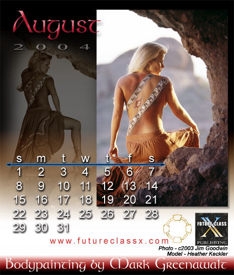 Unfortunately, the 2004 Bodypainting by Mark Greenawalt desktop calendar is no longer available. This was a limited edition printing of full color images printed on card stock and packaged in a uniquely modified CD jewel case that proped up for desktop viewing. Below are the calendar's 12 images. There was also a wall calendar version which featured an additional image for the cover, but it is also out of print .