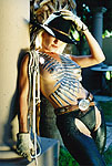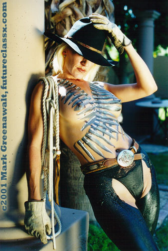 The next elements to add to the mix were the two models, CJ and Rachel. Both were great to work with and although we were a little rushed we had some very interesting conversations during the painting session. CJ was painted with a bandolier of bullets across her chest and liquid latex chaps. Rachel was painted in a blue negligé with a Zorro motif added for effect. Here are two shots from the day in Paradise Valley...