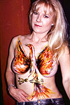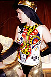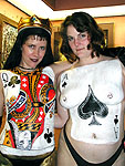 A year later, when the 2002 Exotic Art Show rolled around, we extended the mission with the queen of diamonds bodypainting. By now, Kay and I had the process down pat, but the session still took about 5 hours to complete. This time, for added flavor, the card was decorated with diamond body jewelry that was glued on and we omitted the latex suit to show off a little more skin (and to give her bathroom privileges that the past two paintings didn't afford).
