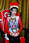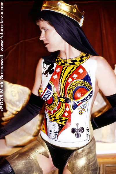 The above image from the queen of spades session was incorporated into the printed invitations to the 2001 Exotic Art Show at the Alwun House. The image was modified in photoshop to be the queen of hearts. For the art show, I asked Kay if she would be interested in being painted with the playing card again, only this time it would be the queen of hearts and she would be put on display for the thousands of visitors to the art show. Once again she rose to the occasion. This time the crown changed and the latex portion of the painting switched from black to red.