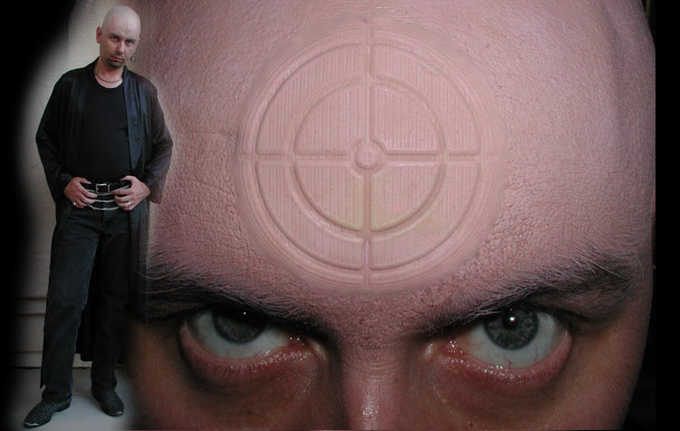 My wife Lori was the Riddler and I went as far as shaving my head to become Bullseye. My friend Ed Clapper designed a mold for the Bullseye forehead target and filled it with Deviant Liquid Latex. I then applied the mold with spirit gum and airbrushed it with Createx flesh colored paint. Here is a close-up of the target.