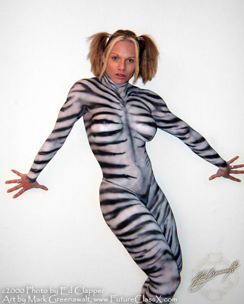 When I was first contacted by Kimberly to do an Ohio State bodypainting on her for her boyfriend, I jokingly replied that I wasn't sure if it would be legal for me to paint that logo since I am a Penn State Nittany Lion alumni. I opted to do the painting, but I wore my Penn State shirt the whole time I was painting just to show where my loyalty laid. Kimberly was sympathetic knowing that Ohio had just trounced Penn State two weeks ago. In fact, Ohio was undefeated at the time (ironically they lost to Illinoise the day that I painted her). This painting was done using a white base of airbrushed Reel Creations bodypaint and then freehand brushed design using Wolfe Brothers face paints. Kimberly rounded up a few props for the photoshoot and I heard that her boyfriend enjoyed the surprise. Click on the picture to enlarge.