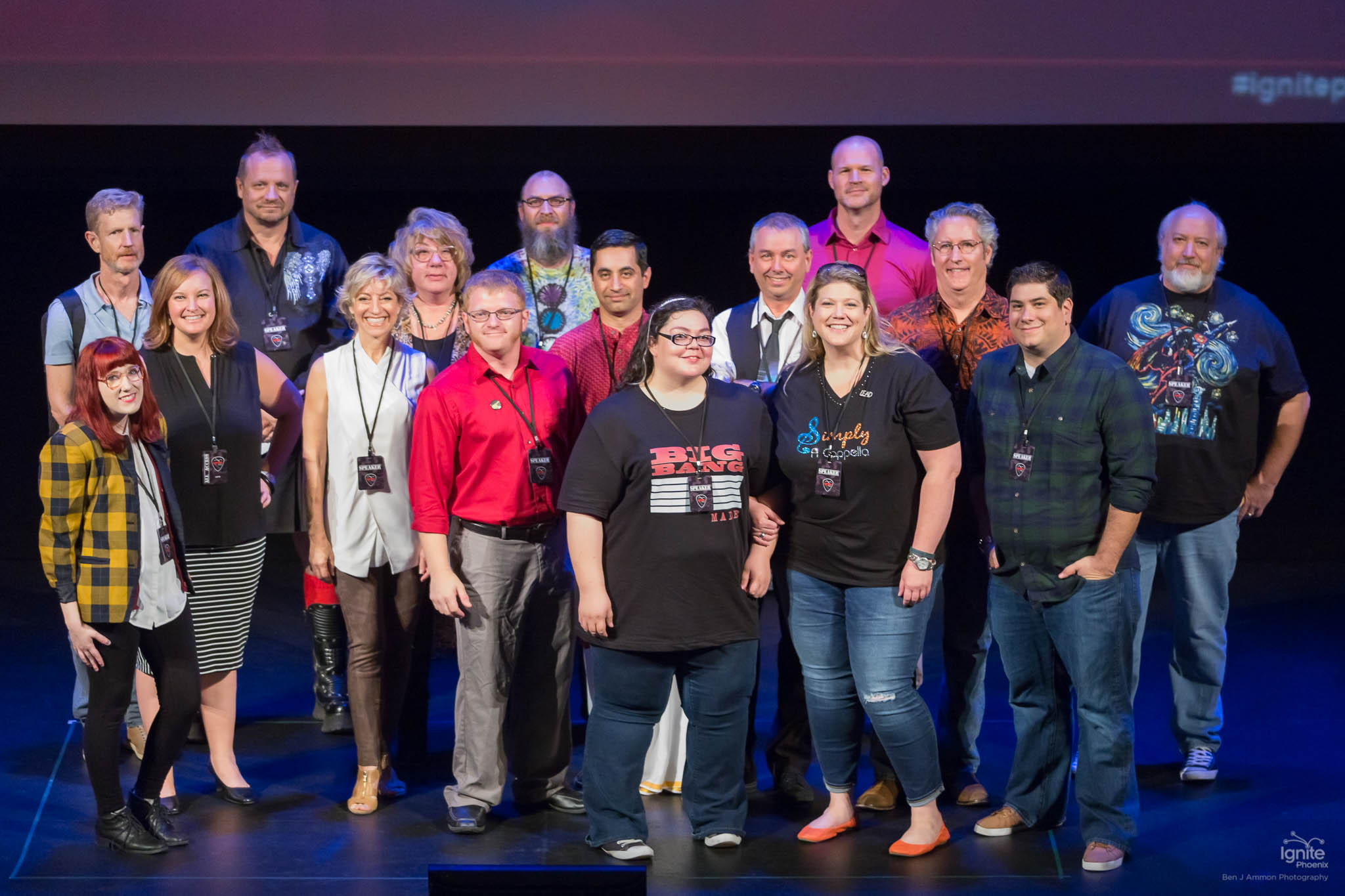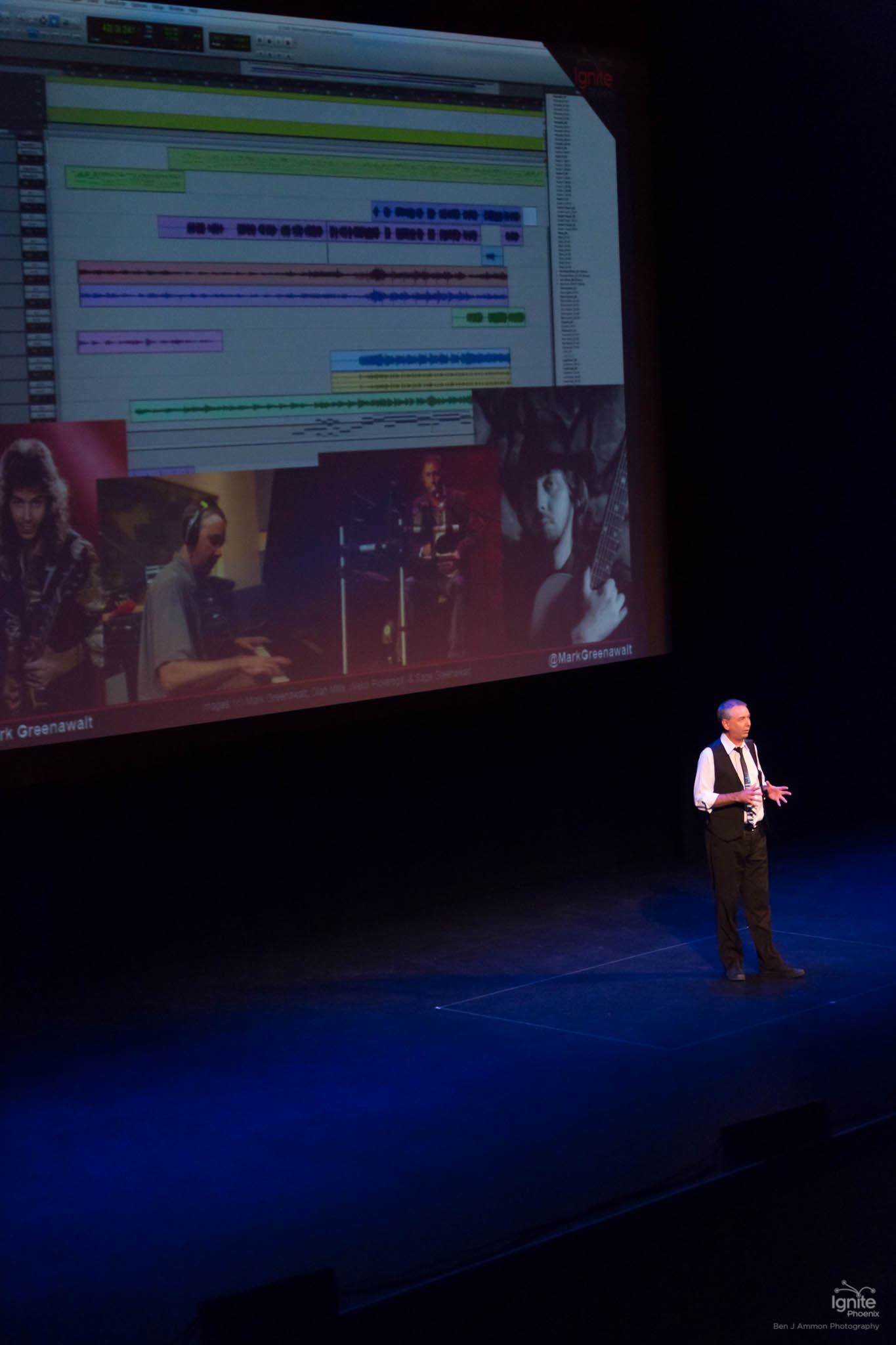 The Ignite Phoenix team put out the call for submissions for their innaugural Ignite Music edition. They received over 60 submissions from people who wanted to share their music-related passions. Sixteen presenters were selected to speak at the Scottsdale Center for the Performing Arts on October 28th and I am honored to say that I made the cut! We each had 5 minutes (20 slides auto-advancing every 15 seconds). My topic was "I wrote and recorded the songs for a 72-hour film challenge" and it was the story behind the making of the short film Wish, Inc. They will soon be posting all of our talks on Youtube and there are already quite a few still photos on Flickr. If you'd like to see the film and hear the songs, I invite you to check the Wish, Inc. page on my website at http://www.futureclassx.com/film/challenges/A3F/2011-WishInc/WishInc.htm .