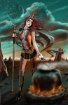 This is a female elven character, who is now haunted and corrupt. Despite her appearance, there needs to be a seductive quality to this character. She is addicted to a magical drug that has warped her appearance and corrupted her personality. The Queen has long straggly hair and a wears a crown of broken glass shards. Around her waist she wears a belt that holds numerous vials or potion bottles (it’s from these broken potions that she has made her crown). A sickle moon tattoo is on her forehead, her eyes are shut, and the entire area around her eyes is black with trails of black tears running down her cheeks. Her arms should be bare, and the same blackness that has colored her eyes rises from her hands up to around her elbows, as well as covers much of her body. It is as though she is being consumed by this drug/potion that she consumes herself. In one hand she holds a wooden staff that is set with an eye, and in the other outstretched hand she holds one of the potion bottles, uncorked, whose vapor trail is rising from the opening.