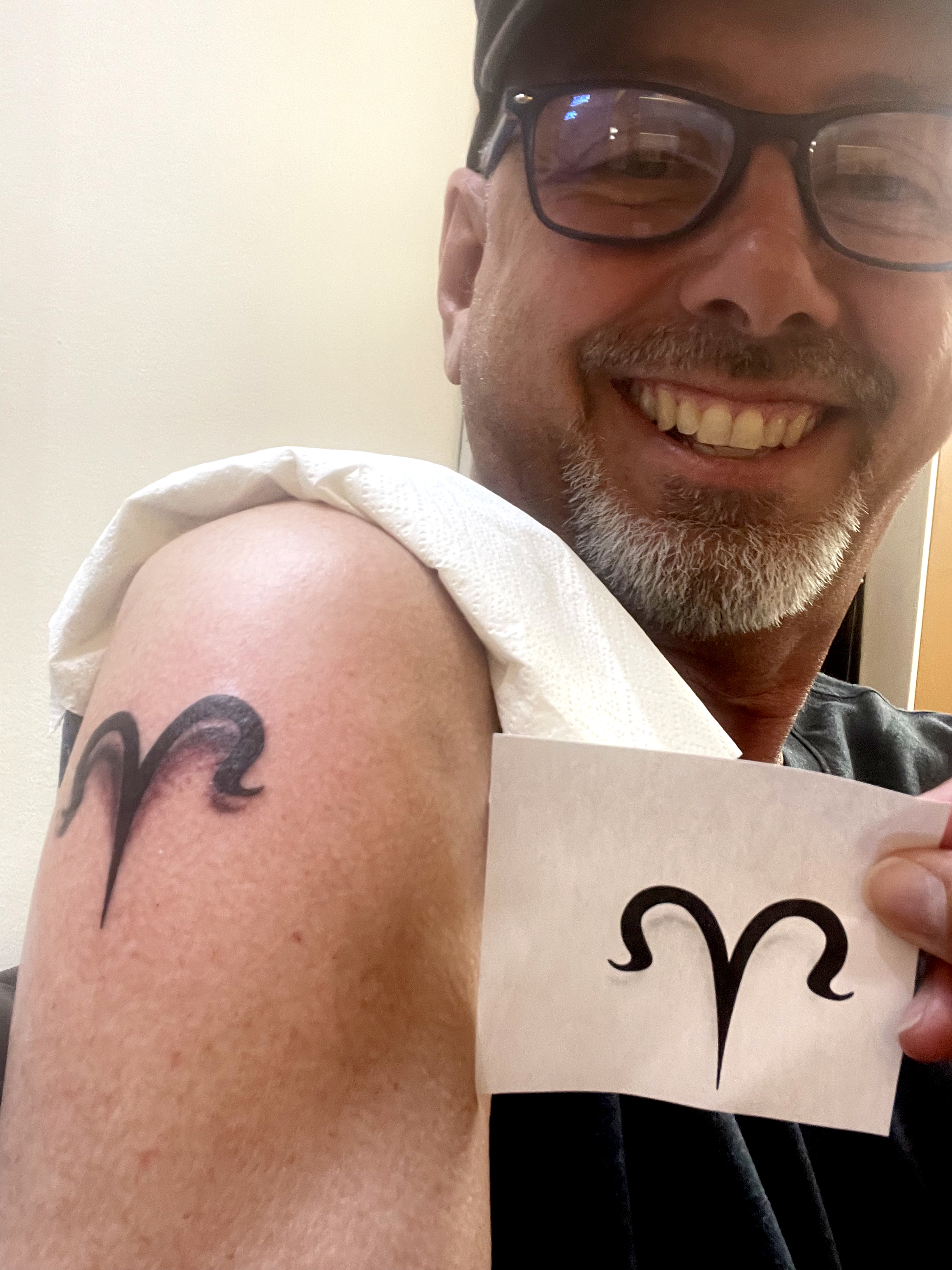While in Athens, my son Zane and I got tattoos. This was my first tattoo at age 56 and I decided to go with my zodiac sign of Aries the ram. I did have a more grandiose design in mind, but this simplified version was just 90 Euros and was the size that made sense...for now. I might add to it the next time I'm traveling abroad. Zane got a Meander design as a cuff on his forearm.