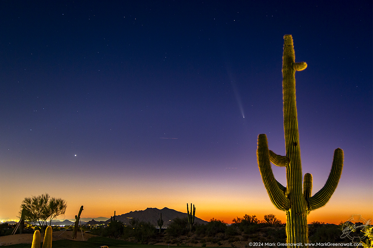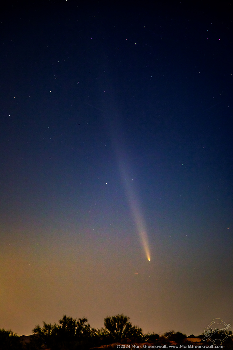 I wasn't prepared this month when the Northern Lights came back to Arizona so I completly missed them. Next I missed the sunset shadows on Superstition Mountain that look like a mountain lion just twice a year. So I vowed that I would not miss the opportunity to photograph the rare showing of a comet in the night skies named Comet C/2023 A3 (Tsuchinshan-ATLAS). I was oblivious to the night when it was the closest and brightest after going around the sun, but luckily it lasted a few more nights before it left for the next 80,000 years. Again I was doing a lighting project that happened to be at a clubhouse in Desert Mountain and it was far enough north to get away from some of the sky glow of Phoenix. The comet looks so cool in photos and I'm so glad to add this to my portfolio of astrophotography, but I must confess that I could barely make it out with my aging eyes. Luckily I have the Stellarium app on my phone that showed me where to look!