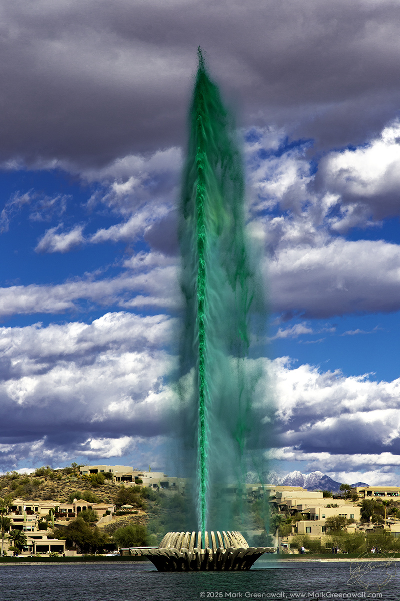 Each year since 1979, the town of Fountain Hills dyes the water green during the St.Patricks Day Irish Fountain Fest. This is was the tallest fountain in the world when it was built in 1970 by Robert P. McCulloch (the same guy that brought the London Bridge to Arizona). It’s now the fifth tallest in the world and second tallest in the US. The fountain shoots water up to 560 feet, driven by three 600 horsepower turbine pumps, every hour (on the hour) for 15 minutes from 9am to 9pm. But the greening is only for this special occasion. My wife and I took our puppy, Honey, along to the festival and had a great time. I got to see my friend Scott Jeffers with his band, Traveler, playing on the main stage and drank a Guiness for the occasion!
