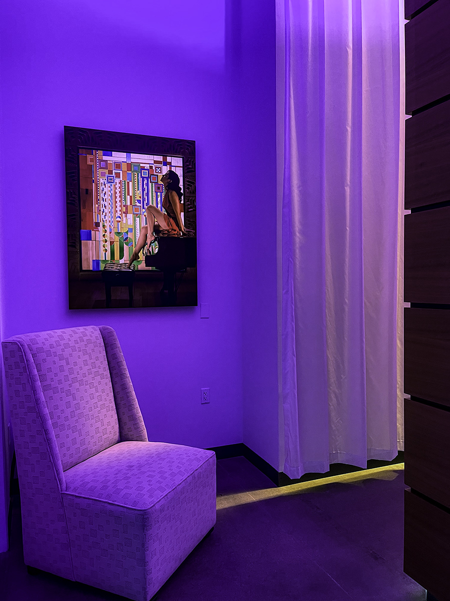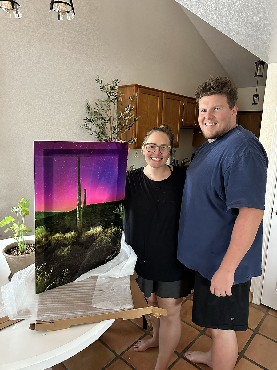 The third image is the first acrylic print I have sold. This image of the Aurora Borealis that visited Arizona is now being enjoyed in the kitchen of these new homeowners. And the fourth one is the beautiful model LuxBot that I photographed at the Arizona Biltmore in front of the stained glass designed by Frank Lloyd Wright. This image is illuminated with a framing projector that spotlights it with white light while the ambient lighting around it is purple and orange. This print is hanging at a design studio near Scottsdale Airpark (that just so happens to be where I work).
