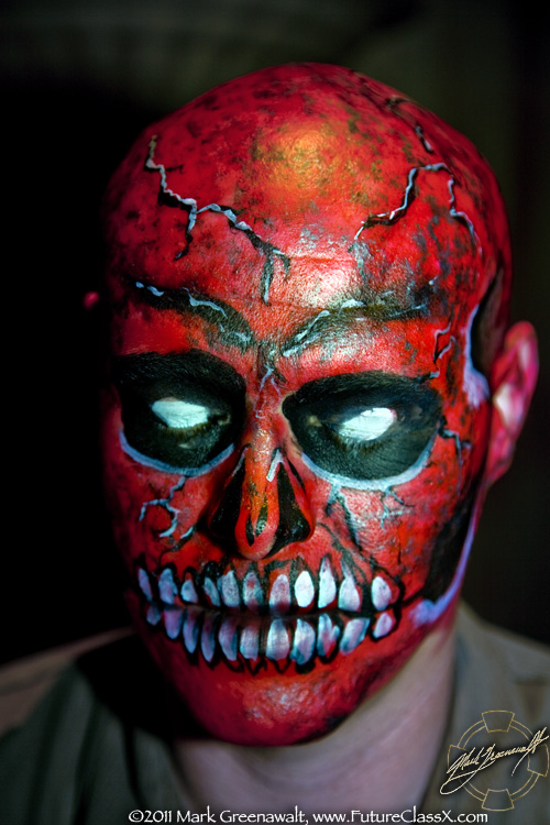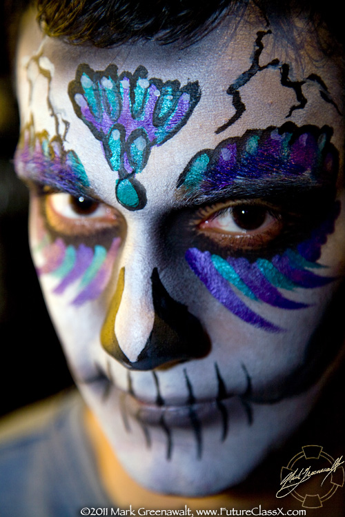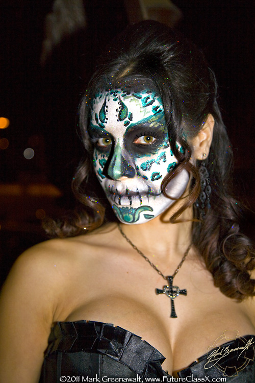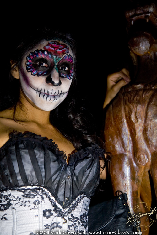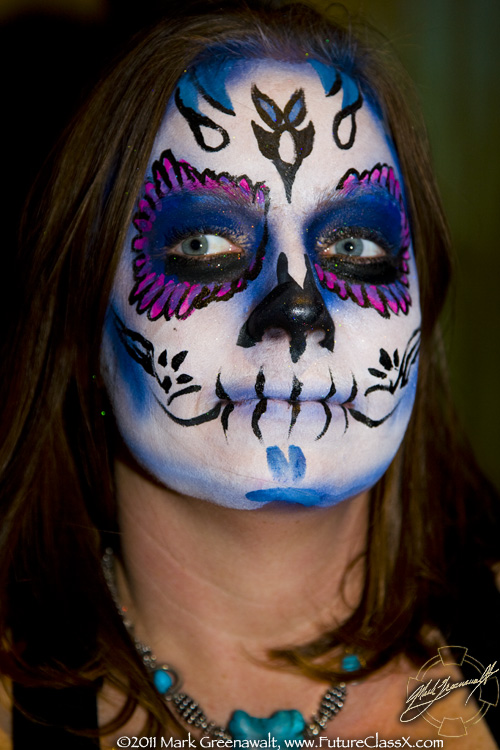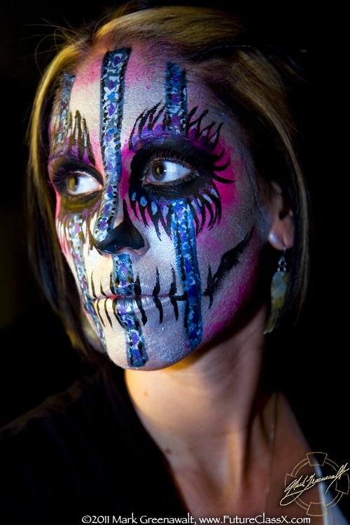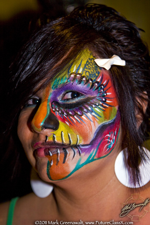This was the extent of what I was originally hired to do, but a month later (3/4/2011) I received a call from fellow bodypainter Mark Reid asking me if I was available to paint that same night. I asked him what the event was and it was so ironic when he told me it was the Subterraneo event that I had helped promote in February. Luckily I was available and I was able to work with two other painters; Nancy Kartoon from here in Phoenix and Allison Halver from Los Angeles. Together we painted 14 of the hired models (see the image at the top of the page) and then dozens of the attendees of the event. I'm not sure if I took a photo of all of the faces that I painted, but here are 11 of my skull faces.
