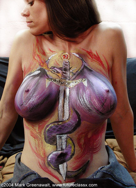 Welcome to the "Alwun House Exotic 2004" bodypainting webpage. These bodypaintings were part of the annual exotic art show held at the Alwun House in Phoenix, Arizona. The date of this year's event was Friday the 13th of February 2004. Just two weeks before this event, Janet Jackson's breast was exposed as part of a "wardrobe malfunction" at the Superbowl Halftime show. The following day the whole world was talking about it including the FCC who was investigating the incident and threatening to sue somebody. Janet was performing a song with Justin Timberlake and at the end of the song he tears off the right cup of her bustier exposing a star shaped medallion nipple ring. Although I agreed that it was an inappropriate setting for this stunt, I loved the costume, the theatrics, and the controversy. So much so that I incorporated the costume into my live bodypainting demonstration. Note that I used to have images of the superbowl pics on here, but received a cease and desist from the photographer's representative and immediately removed the images. These pictures were used for educational purposes and no monetary gain was received from their use. As part of my preparation for the project, I scoured the internet looking for pictures of Janet Jackson and the close-up of the nipple ring. By this time, there were several images that were on every news account of the Superbowl and the close-up was easily found on several sites. Note that I used to have images of the superbowl pics on here, but received a cease and desist from the photographer's representative and immediately removed the images. These pictures were used for educational purposes and no monetary gain was received from their use. My next mission was to find a model and luckily my first choice accepted the mission. Her name is Dale O. Dale has some natural features that resemble Janet Jackson and she went to professional hair and make-up artist Soncerea Richardson (Urban Roots Salon, Mesa) to add the finishing touches. This was the first time that Dale and I had ever worked together. Although she may have been a little apprehensive when we started painting in front of a crowd of about 30 on-lookers, by the time we finished the photoshoot she was strutting her stuff on stage in front of hundreds of attendees. To achieve the look of the black leather, I painted Dale with black liquid latex made by Deviant. Three layers of the latex was applied with a sponge brush and then the final gloss was enhanced by Deviant's Slick Polish. Next I used spirit gum to apply the rhinestones to the neck and left breast cup, noting that most rhinestones were clear except for two red ones (details). The red lace and silver nipple ring were painted on last using Totally Tattoo body paints from Badger Airbrush. I also added a few quick airbrushed hi-lites to the black latex to emulate the leather jacket that Janet was wearing. Here are a few shots from the event. Before the show started, I had completed another bodypainting. The model for this painting was Janet Morrison-Eisner who was also painted at last year's event with a phoenix firebird. For her artwork this year, Janet chose to have a painting by her favorite artist, Vincent Van Gogh, recreated on her upper torso. I chose the painting Starry Night, one of his most popular pieces and it proved to be very challenging, but only took a little over an hour and a half to complete. I again used Badger Airbrush's Totally Tattoo paints, some airbrushed on and all of the daubs of paint were applied with a sable brush. While I was painting Janet, she gave me the full run down on the life and times of Van Gogh. Here are two shots of her body painting. At the end of the night, there was one more volunteer that really wanted to be painted. I had packed up most of my stuff, but she was very enthusiastic about being painted. For her painting I tried an "off the cuff" painting of a sword with a winged serpent wrapped around it. Here are two shots of this painting. Also on display for this event, was a life casting of an actual model that was painted with the Janet Jackson outfit. The life casting was done by Byur Gullwing of www.lifecastaz.com and I did the "bodypainting". Click the image below to see the final product. If you are interested in ordering a print from this photoshoot or would like additional information on bodypainting, please feel free to contact mark@futureclassx.com and visit my website at www.futureclassx.com . Please browse through the additional images from the show below. Thanks for visiting! |