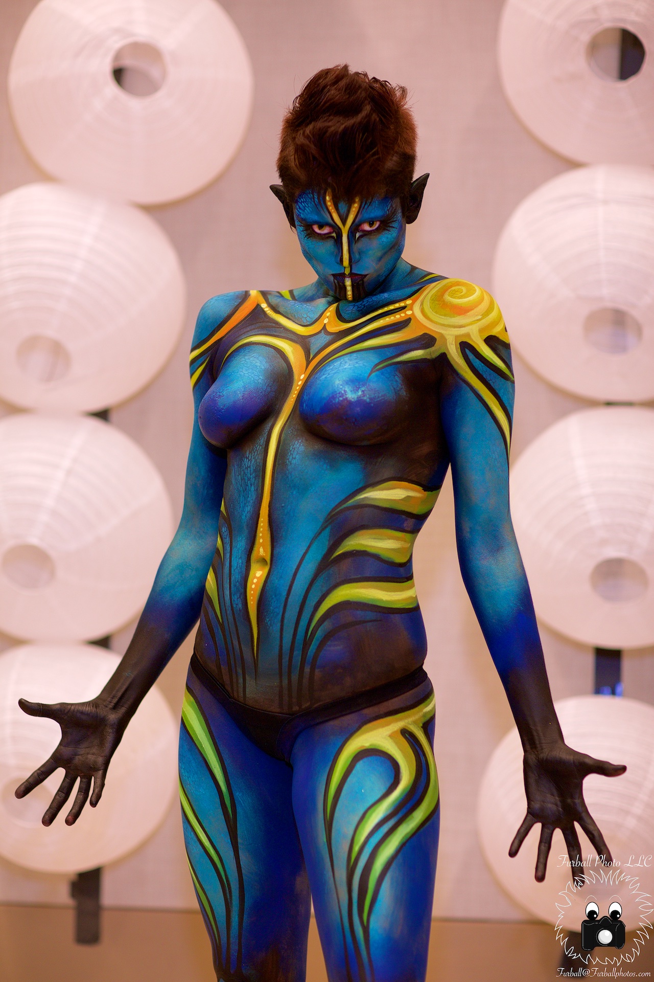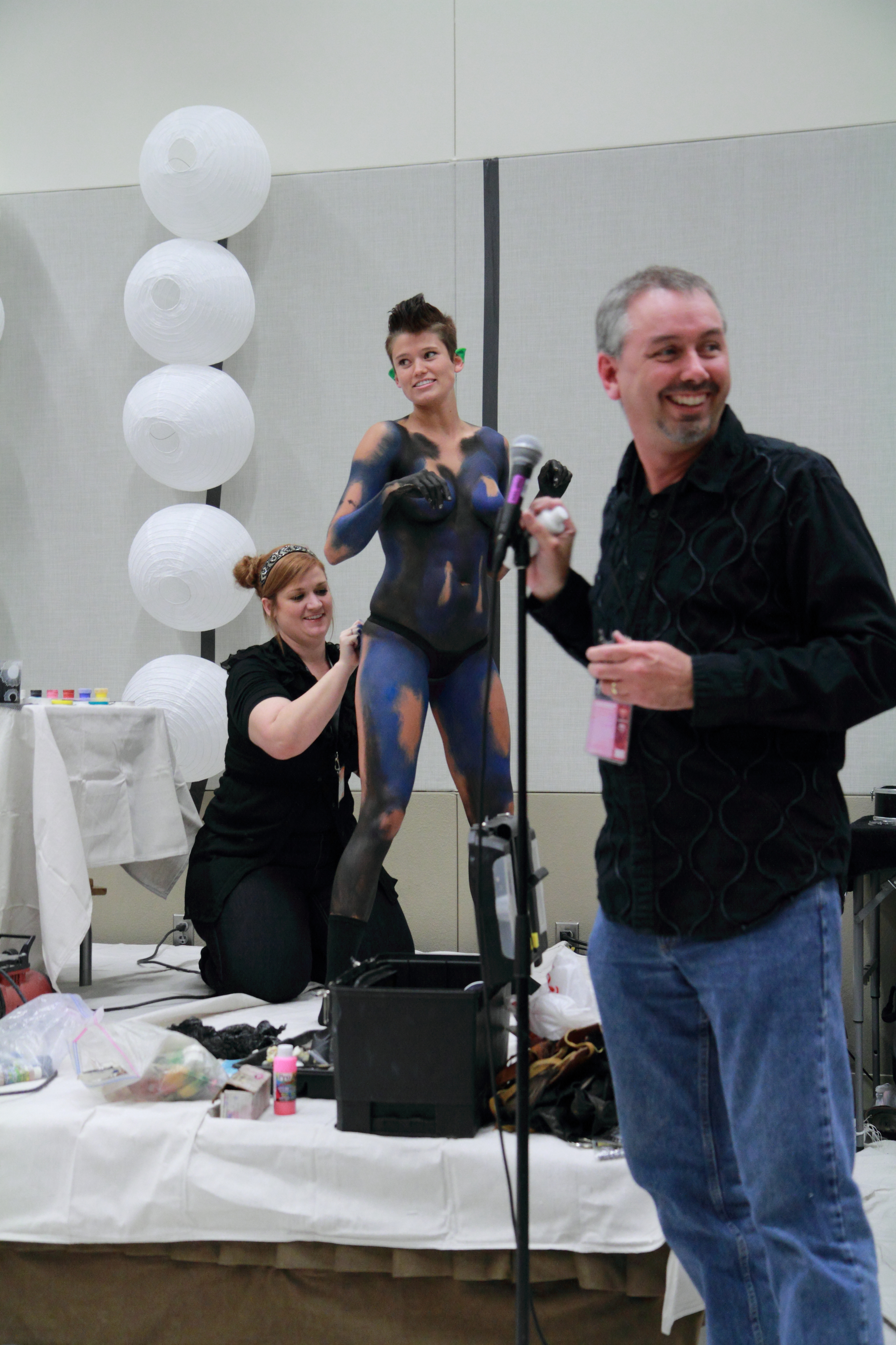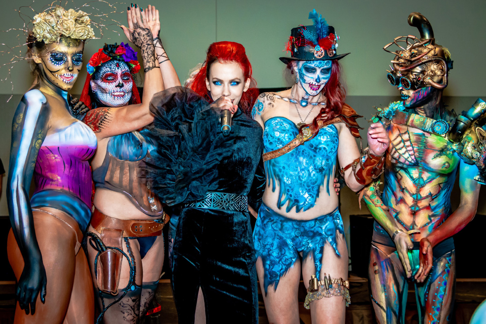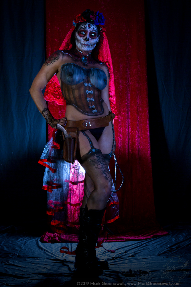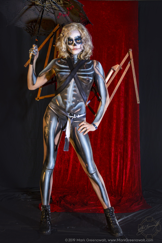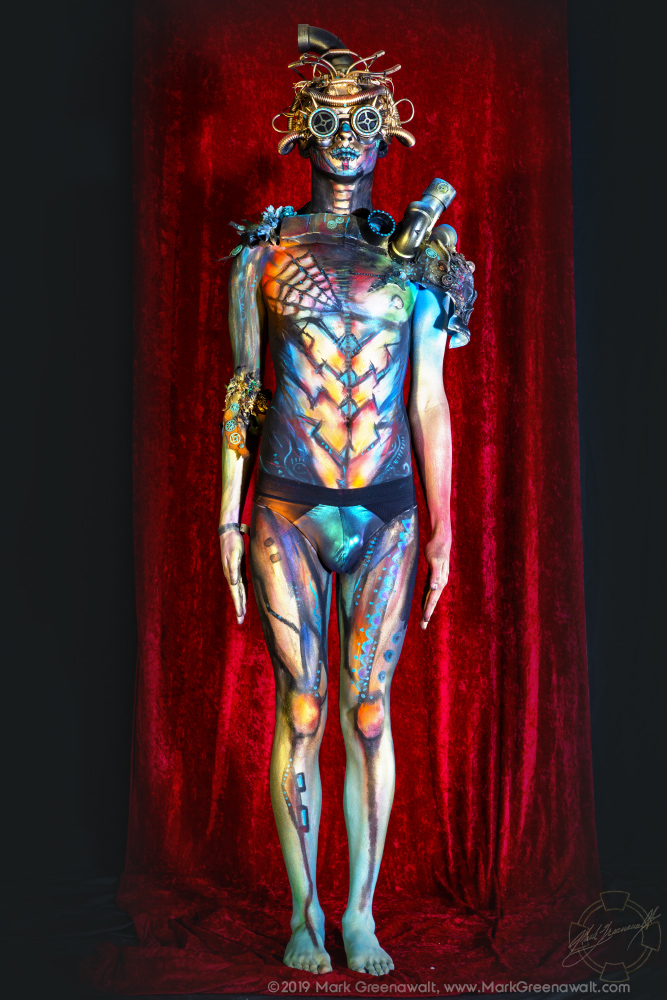 2019's theme for the Phoenix Fan Fusion Bodypainting Extravaganza (PFFBE) was "Steampunk de los Muertos". Five wonderful models painted by five fantastic artists. Artist Brandon McGill paired up with our only male model, Best Tardy. This was Brandon's third Extravaganza (2016 - "Tales Retold" and 2017 - "Androids"). This was Best's first PFFBE. Artist Papi Miranda has been involved in every bodypainting extravaganza (2014 - "Goddesses", 2015 - "Aliens", 2016 - "Tales Retold", 2017 - "Androids", and the ill-fated 2018 - "Monochrome"). This time Papi's model was Violet Pixie who he has worked with on multiple projects, but this will be her first PFFBE. Artist Brandy Wise painted model Elley Cat and this was thier first time at PFFBPE. Artist Amber Yepez painted model Griffin Maria. This was Amber's first PFFBE, but Griffin was there last year for the "Monochrome" project, but we didn't have the opportunity to finish before the fire alarms sounded and brought our session to an end. Artist Mark Greenawalt (Me) will be worked with Paris Harshman. Paris and I have collaborated on quite a few projects including Phoenix Comicon 2009 - "Maleficent", 2010 - "Arachne", and the 2012 - "Isis". By the way, I've been doing these bodypainting panels at Phoenix Comicon / Fan Fusion since 2008. Miss Krystle on the runway with the bodypainted models.