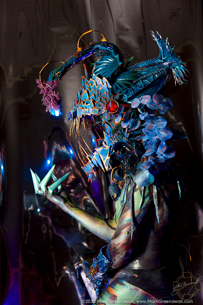 2023's theme for the Phoenix Fan Fusion Bodypainting Extravaganza (PFFBE) was "Animalyze". Four wonderful models painted by four fantastic artists. I designed the flyer above with the models photos and the PFF graphic arts team designed the second flyer and included it in the program and also on the big screens downtown! This year we were again spread out down the runway in the 410-seat ballroom 232-A, B, and C on Saturday night. I believe the room was near capacity most of the evening, but there is quite a bit of turnover for a panel that lasts over two hours. Each year I'm amazed at the creative concepts that the artists come up with once I give them the generic theme to work with. Animalyze produced four radically different concepts including an angler fish, a peacock, butterflies, and a dragon. No cameras were allowed for the first half hour, but once the models had a modest amount of cover, cameras were allowed. So there are quite a few pictures out there that show the progress of each creation. We each had about 2 hours to complete our paintings before the models did their runway walk and then the crowd photoshoot followed by the professional photoshoot. I added a secondary challenge for the artists to include some UV responsive bodypaint on the models this year and the results were so intriguing.