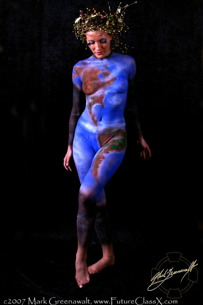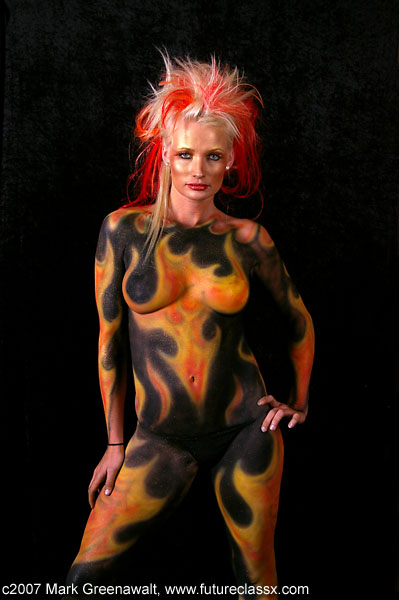 The resort and spa formally known as Caleo has re-invented itself and unveiled it's new ambiance at the April 5th grand opening celebration. The facelift brought with it a new name: FireSky Resort and Spa. The posh Scottsdale resort has adopted the elements of Earth, Wind, Fire, and Water as the thematic elements that distiguish the character of the newly renovated facility. The resort turned to the promotional team at Got You Covered to incorporate these elements into the grand opening festivities wherever possible. There were two mermaids from San Diego doing synchronized swimming in the pool, the Russian aerialist Naughty Niki-ta from Scandalesque was doing her routine in a totally white room, and Dr. Stephen Strange and the Strange Family Circus were breathing fire on the back terrace. My task was to paint four models with the four elemental themes. I was given complete artistic license to come up with the details of the paintings, but they had to clearly represent earth, water, wind, and fire. I had several ideas, but my main goal was to have the paintings make an impact from a distance and that there would be no doubt about their meaning when they were standing side by side. For earth I thought of several ideas to paint the ground or some form of dirt, but the more obvious answer was to take the word earth literally and so I painted the Earth. Water and Fire were the most strait forward elements to paint so I didn't really try to over-think these paintings. I deliberated with Wind a little and thought of going for a tornado, but the spa and resort seemed to call for a calm wind and so I painted a tranquil sky with big puffy clouds. A make-up artist was brought on-board and she did a fantastic job with the crazy hair and long lashes. Her contribution really brought out the best in my work. I started with the fire painting on model Sarah Pirie. I thought that this would be the easiest and the quickest, but it turned out to be trickier than anticipated. Using Reel Creations bodypaints, I airbrushed the yellow flames on first. This loosely defined the design, but the yellow was fairly difficult to see against her tanned skin and it seemed that a lot of layers had to be added for complete coverage. Next I added the depth of the oranges and reds before completing the design with the black. One last finishing touch was to add some gold glitter spray from Kryolan. Here are two shots of Sarah's fire painting. Next up was Lindsey Electra who was to be painted as the water elemental. For this painting I called Fred Blau with Reel Creations to ask for his best deep sea blue green body paint. He sent me an absolutely gorgeous shade of teal. This painting was also accentuated by fluorescent Wolfe Brothers paints for the fish and the coral. The painting had a completely different look under the black light. Here are two shots of Lindsey's water painting. Third to be painted was Chatel Bickett and her theme was the wind elemental. While I was talking with Fred, I asked about a great sky color and he sent me a very vibrant blue. For this painting I borrowed from the style of Santa Fe artist Jim Alford. I first became aware of Jim's work when I was hired to do some touch-up work on the horse that he painted for the Trail of the Painted Ponies. I didn't have the time to be as detailed with the clouds or approach the level of realilsm that Jim achieves, but I think I was able to get the idea across. Here are some shots of Chatel's wind painting. Last but not least was Lady Fontayne from the burlesque troupe Scandalesque. We were running out of time to have all of the models completed for the ribbon cutting so I had to rush a little more than I had hoped. I had brought pictures of the globe and some world maps that I intended on projecting onto the model. But as time was of the essence, I had to free hand airbrush the world. For this painting I used some Mehron paints and some Totally Tattoo. Notice the star fields on the arms and legs. Here are two shots of Fontayne's Earth painting. The models were finished just in time to be propped up on the immaculate fireplace mantles at the resort lobby as the awaiting guests came through the doors. The night was a great success!
