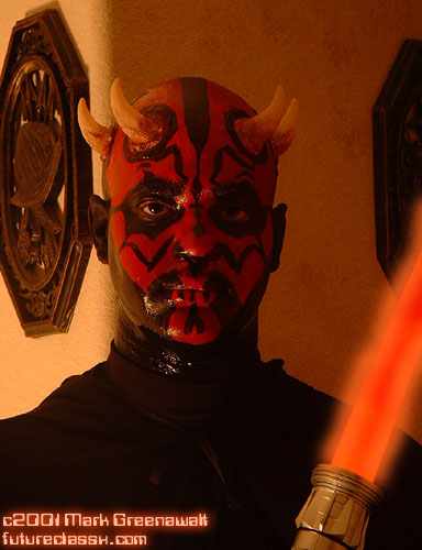 Darth Maul face makeup was painted on me. You know the bad guy in the bad episode of Star Wars. We did the best we could with the horns.