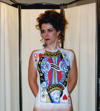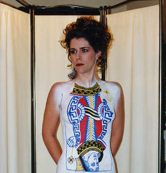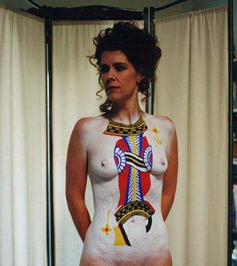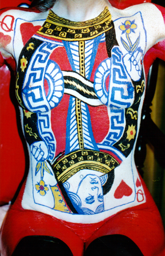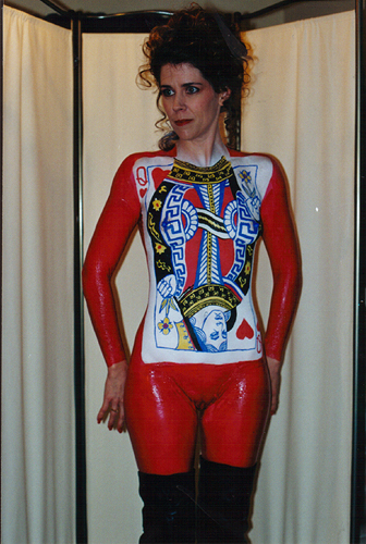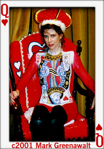 Welcome to the "Queen of Hearts" bodypainting webpage. This bodypainting was the feature of the 2001: An Exotic Odyssey, which is an exotic art show held every year at the Alwun House in Phoenix, Arizona. The date of the event was February 9th 2001. I approached the people who run the Alwun House art museum about doing a live body painting at the event several months prior to opening night. While showing them my bodypainting portfolio, they took a special interest in the Queen of Spades session. They asked if I would paint the Queen of Hearts due to the nearness of Valentines Day and I said yes. The next thing that was a true honor is that they used my queen of spades photographs for the invitations, posters, and flyers, but they had graphic artist David Coven change the colors to red and spades to hearts with Photoshop on his computer. These invitations were sent to hundreds of people in the art community. For this event, I once again chose Kay from Chandler for my model and once again it took 5 hours to complete. Below you can see some progress shots from the session. I painted her at her house and then we made the 40 minute trek to the event, trying not to mess up the paint. The idea behind the image was to make the top face of the card become the models face, like it's popping out of the card. The paints used on the card were Ben Nye face paints. Large areas of color were applied with an airbrush and the finer detail was brushed on. The shiny red paint that looks like a wetsuit was liquid latex paint applied with a sponge brush. For modeling information, e-mail Kay at Kaystuff@cox.net . If you are interested in ordering a print from this photoshoot or would like additional information on bodypainting, please feel free to contact mark@futureclassx.com and visit my website at www.futureclassx.com . Please browse through the additional images from the Queen of Spades bodypainting session below. Thanks for visiting! |