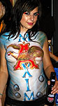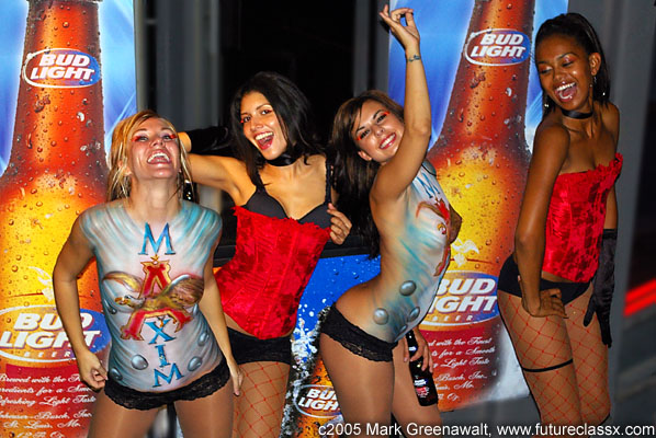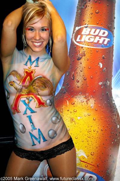 06/03-Boston Cardenas Marketing Network, the promoters for the event, were searching for a bodypainter in Phoenix and I was referred to them by Boston face painter Ginny Colangelo at www.gincproductions.com and then separately by make-up artist Dori Randall. They gave me free reigns to come up with a bodypainting idea that incorporated the logos of Maxim Magazine and Bud Light and after a little bit of time spent in photoshop I came up with the idea to paint the Anheuser Busch "A" logo as the "A" in Maxim. I knew it would be tough to complete in the allotted time they had given me, but it came together just in the nick of time.