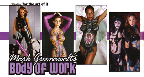 Magazine, October 2004Note: Click on the images above for full size versions. Much of Mark Greenawalt's art will vanish less than twenty-four hours after it's created. It's art that's temporary and ephemeral, and while you'll often see two-dimensional photographs of his creations, the original, three-dimensional pieces have long-since disappeared. Mark Greenawalt is one of the nations best and most sought-after body artists. His creations range from the humorous to the breathtaking, and none of it is meant to last more than a few short hours. Once a traditional artist, Mark now spends most of his creative efforts in painting human bodies. Having done work for Playboy and Razor magazine (and, of course, Playtime), as well as doing promotional work for Cutty Black and Bombay Sapphire, Mark has been attracting a national audience for quite some time. He's also an occasional presence at comic book and sci-fi conventions, and has even received kind words from comic book curmudgeon, Peter David. It's fascinating to watch him work, and it's equally astonishing to see the finished product. Using a range of techniques, from airbrushing to hand brushing, from sponged-on liquid latex to splatter, Mark creates the average body painting in about two hours, but it can be grueling work for both the model and the artist. Usually, the model has to stand for the entire time, while Mark is often required to be in a variety of uncomfortable positions. The end result, however is always rewarding for the model, the artist, and the spectator. Another problem can be that, once completed, the body/canvas moves into positions that can turn one-time straight lines into curves, and transform circles into ovals, which is something Mark has to take into consideration. One of the most difficult parts of body painting for the artist is working within the strict timeframe involved. Mark has a short and limited amount of time to finish his art piece, whether it's for a photo shoot or a live event, and doesn't have the luxury of either stopping to analyze his work, or going back to make changes. The reward, of course, is the final painting displayed on a moving, three-dimensional human being. Mark said, "There's a shock value to it. I can paint the same thing on a canvas, but the fact that it's painted on someone adds a whole other element. The model plays an equally important role in making the image sell. So I can take the same art, draw it on a different medium, and get a hugely different reaction from people." Despite the success and popularity of his body illustrations, and the fact that he's currently writing a book on the art of body painting, Mark has managed to keep his day job at Sullivan Design, where, as an electrical engineer and vice president, he creates blueprints for area schools, hospitals and hotels. As would be expected, Halloween is traditionally one of the busiest times of the year for Mark, so you may not be able to get him to paint-on a costume for you; however, the cost for a full-body illustration is far more reasonable than you'd expect, and is certainly worth considering for any special event you may be attending. If you'd like to contact Mark about having yourself or your partner turned into a work of art, or if you'd like to see more of Mark's work, visit his website at www.futureclassx.com . |