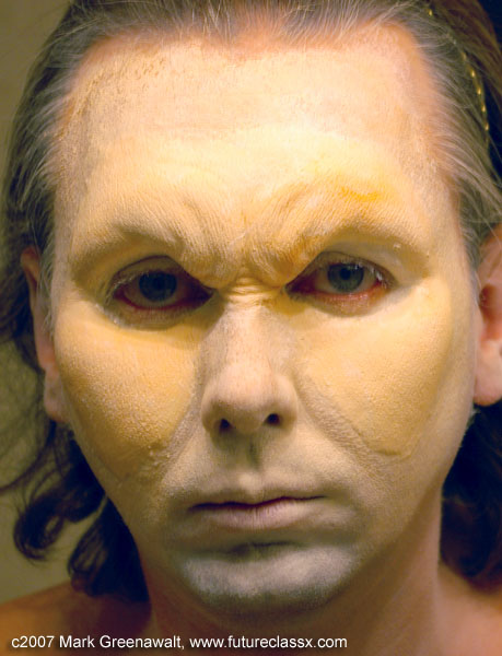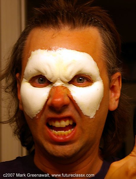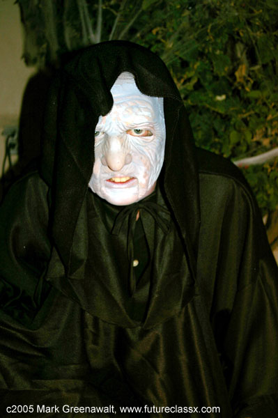I attended a party and decided to do a vampire costume. I had bought a black hooded robe last year to wear for a Darth Sidious costume. I had been studying up on the professional application of prosthetics and everything steered me toward using foam latex prosthetics and glueing them on with Pros-Aid. This was my first project with them and I was very happy with the results. I also invested in a pair of yellow contact lenses and custom vampire teeth. Here are some additional progress shots and a close-up. This same year my son Sage went as a wounded knight. Here is a shot of his SPFX make-up that I applied. 2005In 2005 I bought some rubber latex appliances of an old man prosthetics. My goal was to make it look like Darth Sidious. I didn't have much luck with using spirit gum for the glue and none of my bodypaints seem to adhere to the rubber latex very well, but here is the shot. 2004Well I didn't do any special costumes this year for me or the kids, but I did paint a pumpkin like Ben Grimm (The Thing) and my friend Ed as a Caribean pirate.