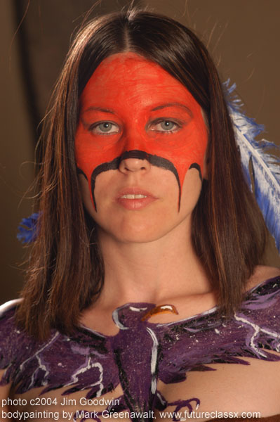 Welcome to the "WesterCon 57" bodypainting webpage. This bodypainting was part of the annual science fiction convention WesterCon, which originated way back in 1948. Each July 4th weekend, this event is held in different "west coast" cities and this year's event came to the Wigwam Resort in Litchfield, Arizona. My live bodypainting demonstration took place on Friday night starting at roughly 8:30 p.m. The theme of this year's event was "Mythology of the Southwest" so I set my sites on doing a bodypainting centered around Native American culture and artwork. As I began my research, I was reminded that one of the models that I had previously worked with had Native American ancestry. Her name is Myla Leigh Chenoa and she and I had worked together on the Arizona Flag bodypainting that was eventually featured in Facepainting International Magazine. Since that time Myla has been gaining a lot of notoriety as an actress as well as an established model and has starred in two recent films named "Stalked" and "A Shadow in the Woods". For more info about her and to see her modeling portfolio, you are encouraged to visit her website at www.MylaLeighChenoa.com . Having lived here in the southwest for about 10 years now, I have become pretty familiar with the art of the Navajo, Hopi, and Apache tribes. Myla, however, is related to the Algonquin tribes of the northeastern part of the United States and Canada. I started researching their artwork and found it to be very different than the southwestern Native American styles. The Algonquin use very bright colors and their designs are much bolder. I found it very difficult to find very many examples of their artwork on-line though. One common trait that I found in most of the Algonquin ceremonial costumes was the use of facial war paint. It was interesting to note that there were no two face paintings alike in all of the images that I found. I chose a face war paint design for Myla that captured the essence of many that I had found. Another feature that I wanted to incorporate was the use of a henna tattoo style of body adornment. For this I wrapped a snake around her arm loosely based on a henna design. Of course the central image painted on her chest was a typical thunderbird from Native art works of numerous tribes. In keeping with the Algonquin's taste for bright colors, the face was painted red, the bird purple, the snake decorated with orange and yellow, and it was all topped off with four feathers painted blue and white. My initial vision of Myla's bodypainting would have had her topless except for the paint, but she came up with a hand made fringed top and matching skirt that worked really well with the painting. Other props that we used to set the scene were a blanket and some pottery from the Wigwam lobby. After completing the painting in front of an audience of about 20 people, we stepped out onto a landscaped terrace to do the photoshoot. Renown photographer Jim Goodwin was gracious enough to donate his time and talent to shooting this project. Although the photoshoot went wonderfully, Jim fell on some bad luck on his way to the Wigwam when his car ran over some angle iron that had fallen off of a truck on the highway. He not only blew his tire, but the wheel also came off. Around 10:00pm I went to pick him up and bring him back to the resort to photograph Myla. Later that night I returned him to his car and it was nearly 3:00 in the morning when we were waiting for a tow truck to arrive. I am thankful that everything turned out O.K. and I truly appreciate the time and effort that both Myla and Jim gave to this project. The following day I served on a panel that demonstrated the use of airbrushes in fantasy art. Also on the panel were artists Sue Dawe, Evelyn Leeper, Meg Lambert, and Richard Enloe. I also had the pleasure of attending an interview session by Evo Terra of the Dragon Page with the media guest of honor, Virginia Hey, the actress who plays the priestess and healer P'au Zotoh Zhaan on Farscape. Here is a picture of her in her body paint for the Farscape set and a picture that I took of her at the convention. She was a very charming Austrailian. According to the website, WesterCon was attended by nearly 750 people this year. From my perspective, it looked like a good time was had by all. If you are interested in ordering a print from this photoshoot or would like additional information on bodypainting, please feel free to contact mark@futureclassx.com and visit my website at www.futureclassx.com . Thanks for visiting! |