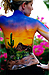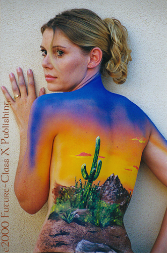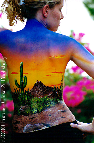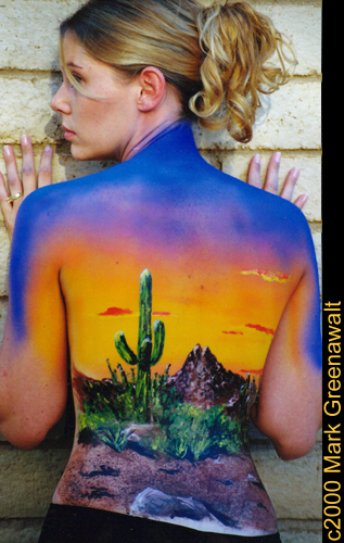 This design was based on a photograph taken at the driveway to the Four Seasons Resort in north Scottsdale. The mountain formation is called Pinnacle Peak. I took a little artistic license with the body painting by making it a sunset scene instead of mid-day colors in the photograph. This painting included air-brushed sky using Ben-Nye paints and the mountain was brushed on using generic face paints. The other interesting note was that the gravel in the foreground was painted using a toothbrush and a splattering technique. If you are interested in ordering a print from this photoshoot or would like additional information on bodypainting, please feel free to contact mark@futureclassx.com and visit my website at www.futureclassx.com . Please browse through the additional images from the Pinnacle Peak bodypainting session below. Thanks for visiting! |