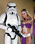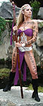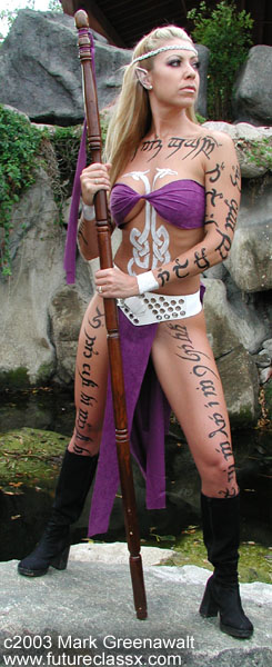 download. Here is the name Rebecca in Tengwar. I have been fortunate to have some great art teachers that have shown me many interesting techniques and one-by-one I have been applying them to my bodypainting artform. I wouldn't have expected to ever have a chance to use calligraphy skills as a body artist, but the cursive Tengwar characters are very similar to the calligraphy fonts that I have often practiced. My next step was to print out some pages of Elvish writing and practice the letters with a calligraphy pen to get the feel of the language. With the motif of my project firmly in place, I set out to iron out the details. My demonstration was to be in the middle of the afternoon and was therefore not an "adult-only" performance. Because of this I wanted to make sure that my model was somewhat covered (although in hindsight, I don't think that there were any kids running around anyway). I designed a costume that centered around a purple loincloth and top and accented by a white belt, headband, and painted on hand cuffs. I bought the purple material and cut it to length just before the audience entered the venue. Meanwhile, Rebecca was braiding the white leather string that I bought. The belt was one my wife used to wear back in the crazy 80's rock and roll days and the ears were glued on to drive home the fact that she was Elven. It's also somewhat comical to note that the staff that she is wielding is actually an old coat rack that nearly threw away (the streamers tied to the staff are a tribute to Liv Tyler's dad). Hmmm. What to write on Rebecca? Well for starters, I wrote the actual inscription from the ring across her arms and upper chest. On her legs I painted the actual inscription from the Gates of Moria (this may have been inadvertantly inappropriate since the translation, I was later told, is "The doors of Durin, Lord of Moria. Speak friend and enter"). On her back I wrote a few fun things that I had translated using the Tengwar program. Maybe someday scholars will be researching my work trying to translate the jibberish. The last part of the painting was actually somewhat of an afterthought. I had been planning to do a bodypainting of a Celtic knot that would cover a models belly, but leave the breasts exposed. I chose to use up the idea on this project and I am very happy with how it compliments the Elvish characters. The painting took about one and a half hours to complete in front of a small crowd of about 12 to 15 people. The paint that I used for the project was Badger Airbrush's Totally Tattoo. All of the lettering and the Celtic knot were applied with a flat brush. I did airbrush a little paint on the ears to make the tips match her natural ear color too. The moment we we completed and ready to do the photoshoot, the skies let loose a gentle rain that kept us waiting for about 45 minutes before getting started. The photoshoot took place in an abandoned waterfall feature at the front of Embassy Suites parking lot. If you are interested in ordering a print from this photoshoot or would like additional information on bodypainting, please feel free to contact mark@futureclassx.com and visit my website at www.futureclassx.com . Please browse through the additional images from the show below. Thanks for visiting! |