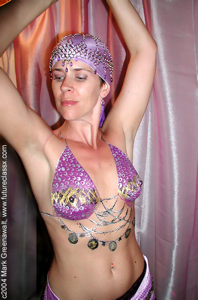 Next on my agenda was one of my "most-painted" models, Kay Kochman. On the night before the event, I had a model bail out on me and lucky for me, Kay was ready, willing, and able to step up to the plate and fill the position. I had planned on doing a crusader motif (kinda' like a Joan of Arc with painted on chainmail), but Kay had spent the early part of the day at the Renaissance Festival and bought some articles of clothing that lended themselves well to a belly dancer motif. As you can see from the pictures, this idea was too good to pass up and I painted a gypsy top on her and she donned all of her skirt veils and headdress. More pictures are soon to come from O'D for this bodypainting.