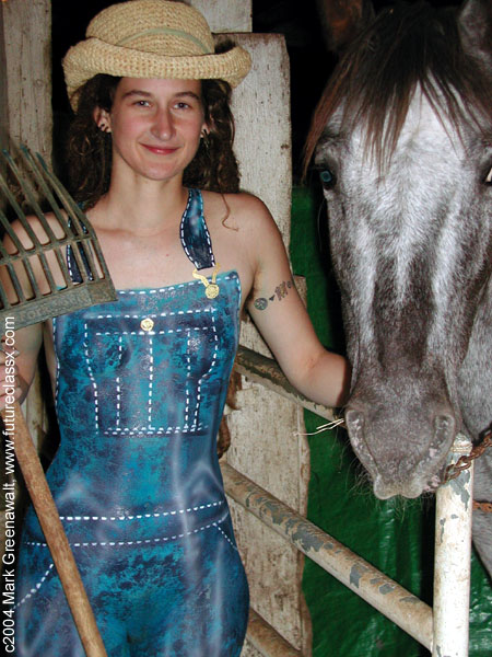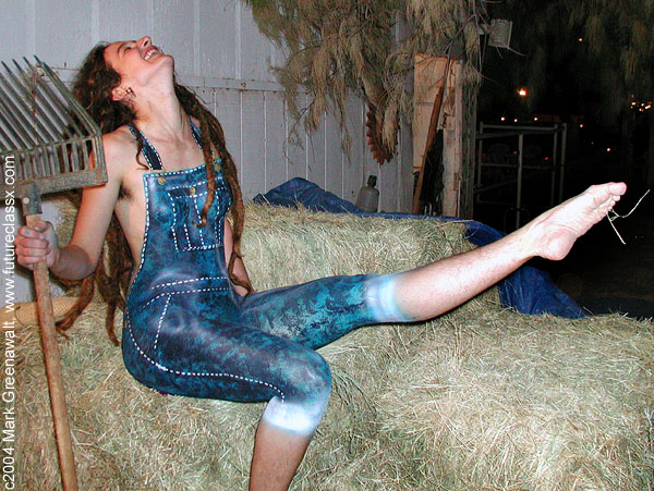 For my finale, I worked with Phoebe, a friend of Kim and a self-proclaimed bohemian girl. When she mentioned that she hadn't shaved, I mistakenly implied that she was just alluding to her pubic hair, but now I know what she meant by bohemian. I warned her that the bodypaint may be very tough to remove from body hair, but she decided to "tough" it out and we embarked on masking her for the bib overalls design. I used Reel Creations bodypaint to airbrush the base coat of light blue and after that I went back and faux finished the base coat with a much darker blue by Totally Tattoo. The painting was accented with a stenciled white stitches. For Phoebe's photoshoot we headed into the barn and set up on the bails of hay. Phoebe mentioned that she had done some modeling for art students, but I didn't anticipate how genuine she would be to work with during the shoot. She was a natural and completely "fit" the image.