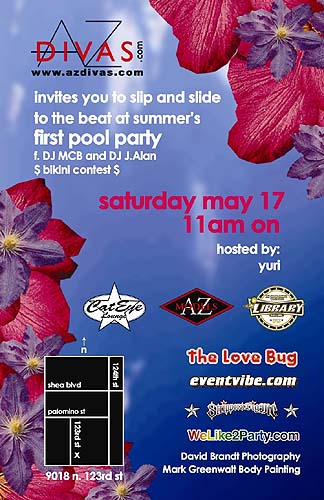 AZDIVAS.COM Pool PartySaturday, May 17th, 2003What a very, very hot day it was for a wild pool party in Scottsdale, Arizona. The pool water was still a little chilly, but it felt warmer to all of those with higher blood-alcohol levels. Chad Smalley, the genious behind AZDivas, had put together a cast of hundreds of gorgeous models in sexy bikinis and rounded out the party with an even greater number of guys who actually thought they stood a chance of taking one home. Chad had contracted me to paint bikini tops on four of his top models to parade around the party. Six models had expressed interest, but in the end only two of them came through (Shannon and Jesse). Of course, there was a plentiful supply of willing fill-ins at the party so volunteers Jessi and Xea became the third and fourth bodypainting canvases. All of the bodypaintings were completed with Badger Airbrush's Totally Tattoo Body Paint and nearly all of the work was applied with a Badger 155 airbrush. Feel free to click on the images below to enlarge the images from the day that I took with my digital camera. To see more of Shannon and Jesse, please visit them at www.azdivas.com . |