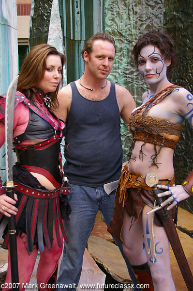 In hindsight, the legend of King Arthur may not be the most representative story for a horror and sci-fi convention, but I was incorporating the genre of fantasy as a subset of science fiction. More importantly, I was recreating a movie character that I found to be sexy, powerful, and intriguing. I did have a second plan to recreate another character, Stephen King's Carrie, and covered a white gown with red paint and stage blood. This would have justified the horror genre for my demonstration, but unfortunately the model that I had secured never made it to the event. Model Paris Harshman, however, did show up and did a fantastic job as Guinevere. The painting itself is fairly simple so we started painting about 2 hours before the seminar. I chose to paint her with Mehron water-based liquid make-up so that it would be easy to for her to remove it after the event. I knew that the paint only had to last long enough to take pictures and then stand around at the seminar. I mixed up a concoction of blue and white and then ran it through a Badger airbrush powered by a Badger compressor. The designs were brushed on with Paradise face paints by Mehron. The only trouble that we had was sprinkles of rain that visited every once in a while that threatened to remove her paint job. Kevin once again did a fantastic job on the outfit. Using leather remnants from previous projects and leather belts from the local thrift shop, he was able to recreate the movie costume while adding a splash of his own flair to the details. Unfortunately the leather didn't get along with the paint where it rubbed against Paris's skin, but ironically I think that it added a little bit of reality to the painting. I imagine in the days of yore when they painted themselves for battle and then donned their leather armor, the paint would rub off in areas. In addition to the Guinevere costume, Kevin had also prepared leather costumes for two other models and brought along his bodypainting kit to paint them. One of his models wasn't feeling well and bowed out, but the other was painted with an intricate red scale design. Also joining us on the patio was artist Jason Kimbell. He was applying realistic scar make-up effects to his model. Our projects were completed around the same time and we set off to do the photoshoot in an abandoned fountain in the city courtyard and then we were off to the seminar. The seminar was moderated by Joe Gruberman and I was joined on the panel Jason, Kevin, Nathan Blaine, and one other guy (can't seem to track down his name, but I'll get back to you on that if your interested).. Our models were brought in and we were given the opportunity to explain the process to those who hadn't seen us painting. After that we were interviewed about everything from how we got started to where we planned to take our crafts. Here are a few pics from the day. |