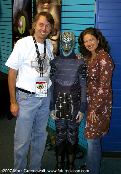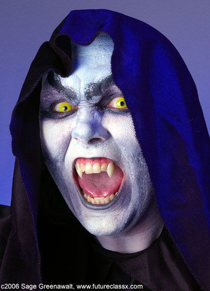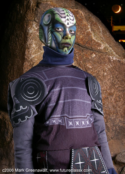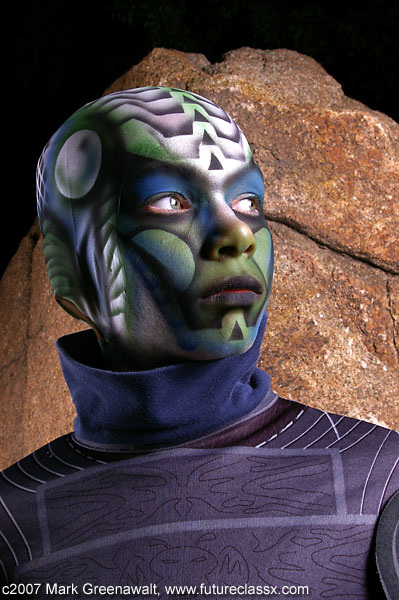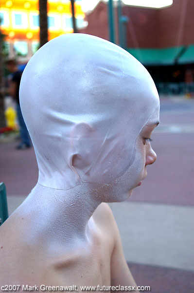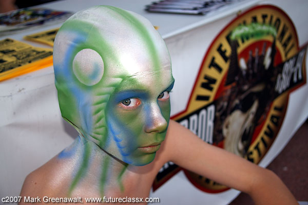 DAY 1Since it was a film festival, I wanted to incorporate something from the realm of special effects make-up techniques. I had never really tried to do a bald cap and thought this might be a good opportunity to try it out. Earlier in the year I had painted a Captain America outfit on a bald male model and found that a shaved head is a high-impact canvas. This time I didn't need to find a model with a shaved head, just someone willing to have a bald cap glued on for several hours. Yes, that's my son, Sage, playing the guinea pig for me once again. For countless bodypainting projects, I have used spirit gum to glue on jewels, feathers, glitter, etc. and it has worked well. I tried using it on a rubber Halloween mask the year before and it didn't work well at all. I did some research and found that most pro make-up artists use a product called Pros-aide to glue on prosthetics. I ordered a small jar of this and laid my hands on some foam latex prosthetics and the weekend before this film festival tested the products on myself and came up with this vampire character (oh, yeah, and I added the colored contacts and fangs for effect). The Pros-aide held perfectly and now I was willing to use it for the bald cap project (note: the Pros-Aide was very tedious to remove and required Pros-Aide remover so I don't recommend trying this product without some level of make-up artistry skills). The ears would typically be cut out of the bald cap, but I had decided to go for an alien-robot look and decided to cap the ears too. This proved to be a little tricky getting the seams to go away, but in the end it looked okay. I started gluing from the center of the forehead and then moved outward till I reached the seam at the ear and then did the back of the neck to the ear seam. Next I painted the face and bald cap with an assortment of airbrush paints from Temptu, Mehron, and Graftobian. Some of it was freehanded and other portions were done with hand-cut stencils. I found the outfit at a Savers thrift shop for about 5 bucks and generally kept with it's color scheme. The hands were also painted to match. Here are a few progress shots of the process. It had gotten dark while we were wrapping up the painting process and luckily I had brought along studio lighting to get some good night shots. The photos with the rock in the background were taken inside of an out-of-commission fountain which proved to have a very alien look in the images. After the photoshoot, my son and I went off to schmooze with some of the celebrities at the convention. First up was Heather Langenkamp, the beautiful actress who played Nancy Thompson battling Freddy Kruger in the Nightmare on Elm Street movies. Next was author Michael A. Stackpole who has penned several Star Wars novels and then Brian Pulido, creator of Lady Death and Purgatori and the co-founder and festival director for the film festival. Here are a few of our shots. Next Sage and I got to hang out at the festival and watched the Star Wars fan film series. The night was capped off at the International Horror & Sci-Fi Film Festival Costume Contest. It was well past his bedtime when Sage finally heard the results, but it ended up being well worth the wait. Here is a picture of him receiving the "Costume Contest Winner" plaque from Heather Langenkamp, Mick Garris (Showtime's Masters of Horror Series), and Chris LaMont (President of the Phoenix Film Foundation). Cool!