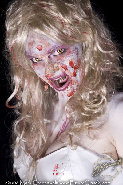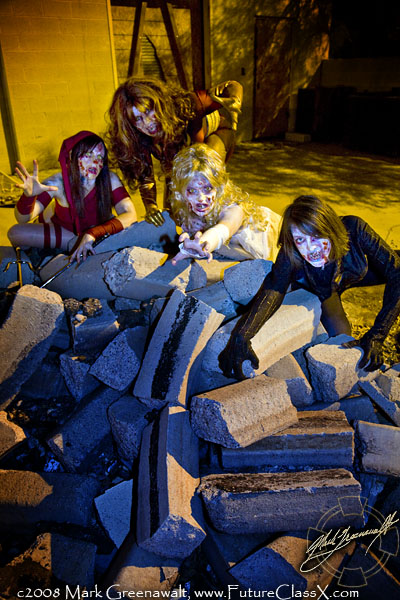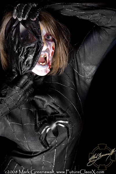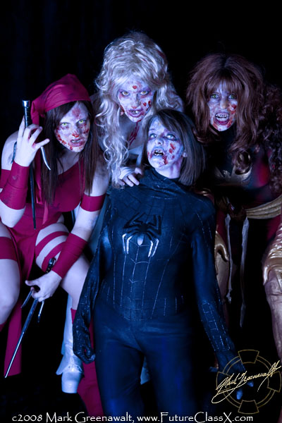 For the 4th Annual Horror and Sci-Fi Film Festival in October of 2008 I teamed up with Phoenix ComiCon to do a repeat performance of the Marvel Zombie presentation that I did at the 2008 Phoenix ComiCon event. I was so glad that I was able to get three of the girls from ComiCon '08 to work with me again for this project. Joanne reprised her role as Elektra while Courtney and Donna created new Marvel Characters, The White Queen and Dark Phoenix, respectively. Joining us for this project was Cira and I costumed her in the Black Spider-man costume that my friend Ed constructed (with a bit of help from me). I did the make-up a little differently this time also. I learned a few new tricks from one of the other instructors when I was teaching a class at the UK Face and Bodypainting Convention earlier in the month. In short, it involved latex, cotton, and tissue paper for the materials and then some grease paints and face paints for the coloring. Of course there was a little stage blood thrown in for good measure. One of the celebrity guests at this year's event was actor Jeffrey Combs from the classic horror film Re-Animator. His other film credits include FearDotCom, House on Haunted Hill, and I Still Know What You Did Last Summer. Here is a shot of him with the Zombie girls.