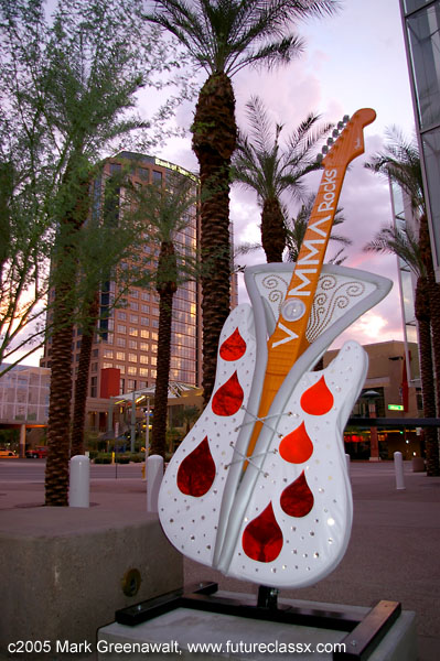 This public art project is collectively known as GuitarMania, benefiting Big Brothers Big Sisters of Central Arizona (BBBS), the Rock and Roll Hall of Fame and Museum education fund. Brian Hassett of BBBS explains, “Our mission has been to raise money and awareness by having sponsored artists transform 90 guitars and place them on public display throughout the valley for five months. Then the project will culminate with a live auction at the Dodge Theater on February 4, 2006.”